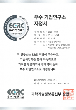 우수 기업연구소 지정서